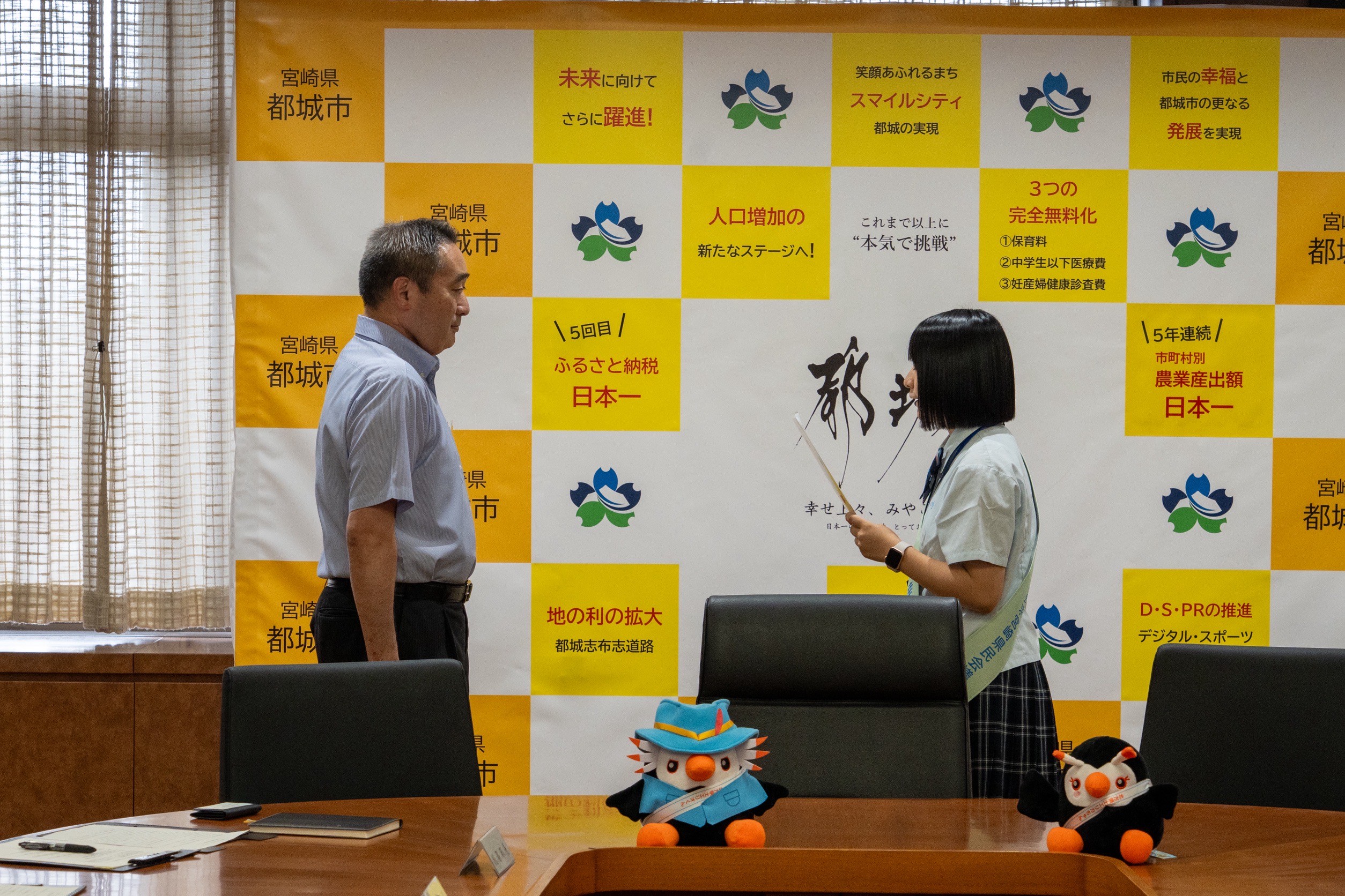 ◇28日県庁講堂で副知事、副議長、県教育長をはじめ、県庁職員の方々にご臨席いただき、出発式を開催したのち、国富町、綾町、三股町を訪問しました。
